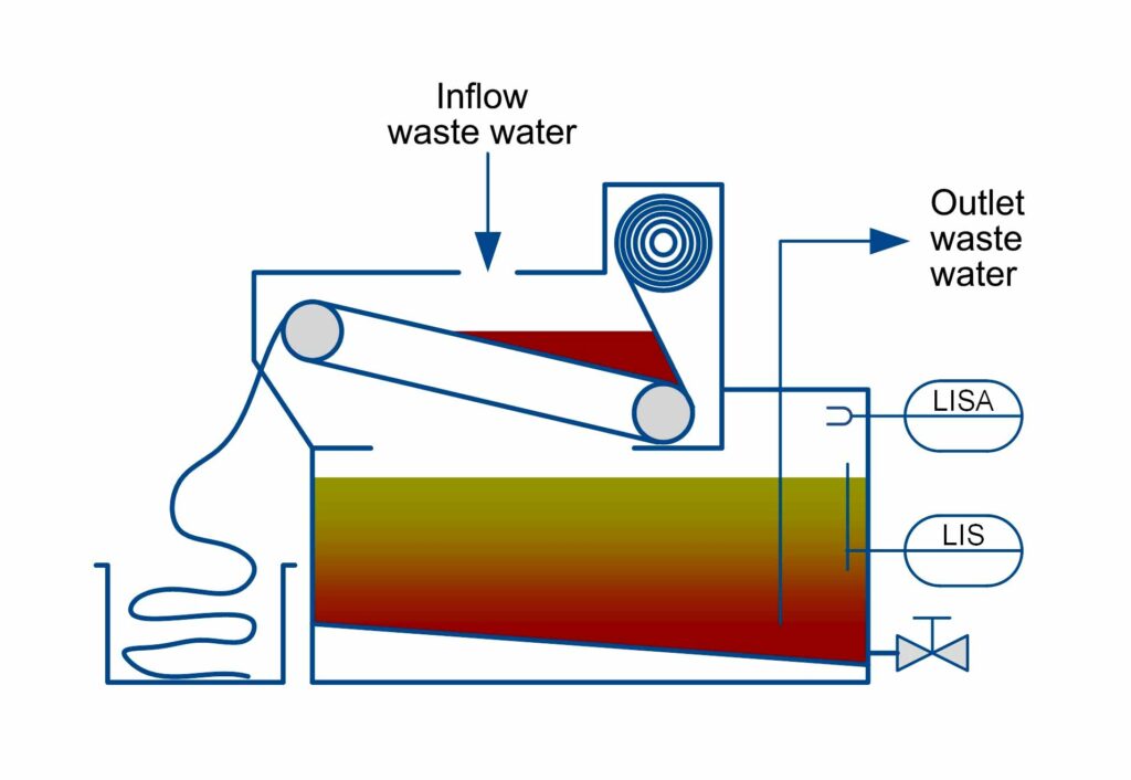 The KLC-Belt Filter (BELFI) is a compact module for the continuous separation of solids from process water. The process water is then fed into the KLC evaporator. The contaminated process water is guided through a gull onto a fleece-lined filter belt. The solids settle and solidify in a filter cake on the belt. The filtrate, which is now free of solids, passes into the filtrate tank where it is stored. As more solids build up in the filter cake, the liquid level in the filter bed rises, until a level switch triggers the motor to move the used belt portion to provide a new, clean fleece filter surface. The used fleece is fed into the sludge tank. Various fine filters options or fleece variations are available for all types of filtration requirements. The filtrate tank can be used as process water storage for the evaporator. Provisions are made for modular integration of the belt filter into the treatment process and into the KLC evaporator control.